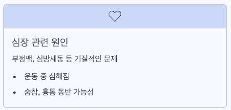 | 심장 관련 | 부정맥, 심방세동, 심근질환 | 운동 중 심해지거나, 숨참·흉통 동반 가능 |