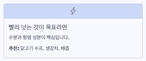 이 경우에는 수분·전해질·단백질·항염 성분이 핵심입니다.