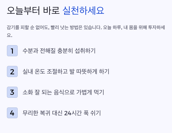 아래 5단계를 그대로 적용하면 몸살 감기가 훨씬 짧게 지나가는 경우가 많습니다.