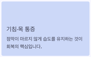 - 목 점막이 마른 경우가 많아 가습 유지가 핵심입니다.