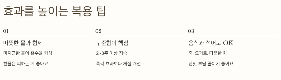 처음에는 적은 용량으로 시작하고, 따뜻한 물과 함께 꾸준히 복용하면 안정적으로 효과를 느낄 수 있습니다.