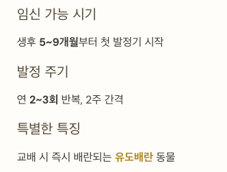- 발정기는 보통 2주 간격으로 반복되며 행동 변화가 뚜렷