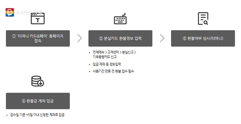 분실 또는 도난된 카드의 환불은 '티머니카드&페이' 누리집에서 '분실신고', '입금계좌 등록'을 하면 됩니다. 단, 이는 '티머니카드&페이'에 카드를 등록하고 분실/도난 안심 서비스에 가입한 경우에만 가능합니다.