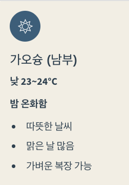 - 가오슝 → 컨딩(켄팅) 쪽은 온화한 날씨 기대치가 높음