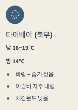 타이베이는 숫자상으로는 영상이라도, 바람 + 습기 + 흐린 날이 겹치면 체감이 내려가요. 그래서 “분명 18도인데 춥다”는 후기가 나옵니다.