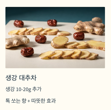 - 생강 10~20g을 함께 끓여 톡 쏘는 향과 몸을 따뜻하게 하는 효과를 더합니다.