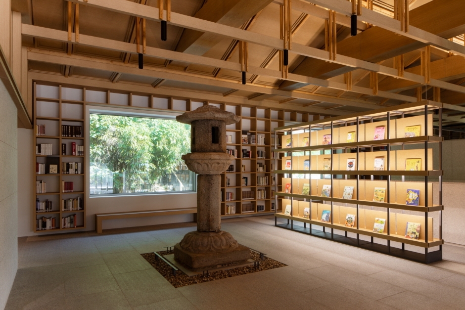 입구에 들어서면 가장 먼저 눈에 띄는 것이 바로 웅장한 석등 입니다. 이 한 가지만으로도 이곳의 특별함을 느낄 수 있어요. 차분하면서도 고풍스러운 분위기가 도서관과 완벽한 조화 를 이루고 있습니다. 마치 시간 여행을 온 듯한 착각이 들 정도예요!