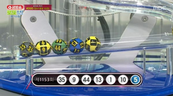 이번 회차의 당첨번호는 ‘1, 9, 10, 13, 35, 44’입니다. 보너스 번호는 ‘5’입니다.