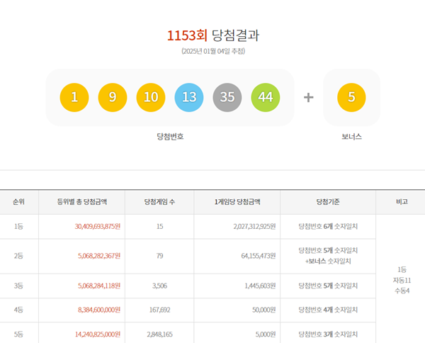 1153회 로또 당첨번호 및 결과
