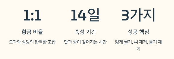 단맛이 부담되면 “1:0.8”로 줄이기도 하지만, 초보는 1:1이 실패가 적습니다.