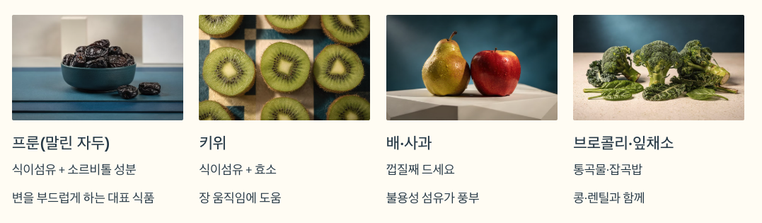 아래 음식들은 식이섬유 + 수분 + 장 자극 요소에 유리해 배변을 부드럽게 돕는다고 알려졌습니다. (질병관리청 건강정보)