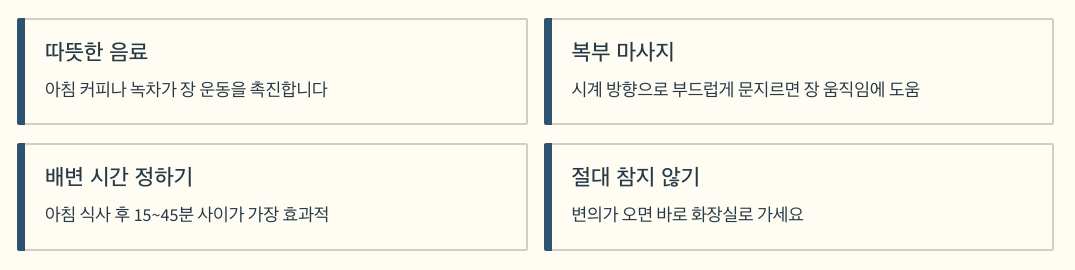 - 따뜻한 음료(아침 커피/녹차)는 장 운동을 촉진할 수 있어요. (존스 홉킨스 의학)