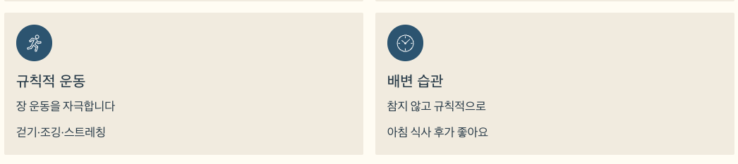 → 규칙적인 신체 활동은 장 운동에 도움을 줍니다. 가벼운 걷기라도 꾸준히 하면 효과적이에요. (nhs.uk)