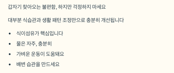 변비는 뒷목 잡히는 증상처럼 갑자기 힘들어질 때가 많습니다. 하지만 대부분의 경우 식이나 생활 패턴을 바꾸는 것만으로도 충분히 개선할 수 있어요. 특히 식이섬유·물·운동·습관을 중심으로 접근하면 효과가 큽니다. (Mayo Clinic)
