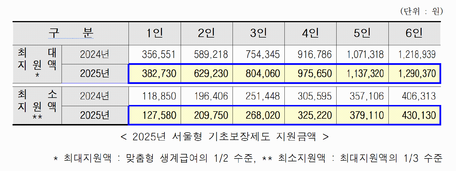 - 1인 가구: 월 최대 382,730원 (전년 대비 7.34% 인상)