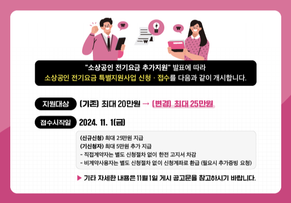 전기요금 인상 부담을 줄여드립니다! 2024 소상공인 전기요금 특별지원 사업, 최대 25만 원 지원. 간편 신청 방법과 대상 조건 지금 확인하세요. 2024년 전기요금 인상으로 경영 부담이 커진 소상공인들을 돕기 위해 중소벤처기업부는 소상공인 전기요금 특별지원 사업을 시행하고 있습니다. 이 사업은 최대 25만 원의 전기요금을 지원하여 소상공인의 경제적 어려움을 완화하는 데 목적이 있습니다.