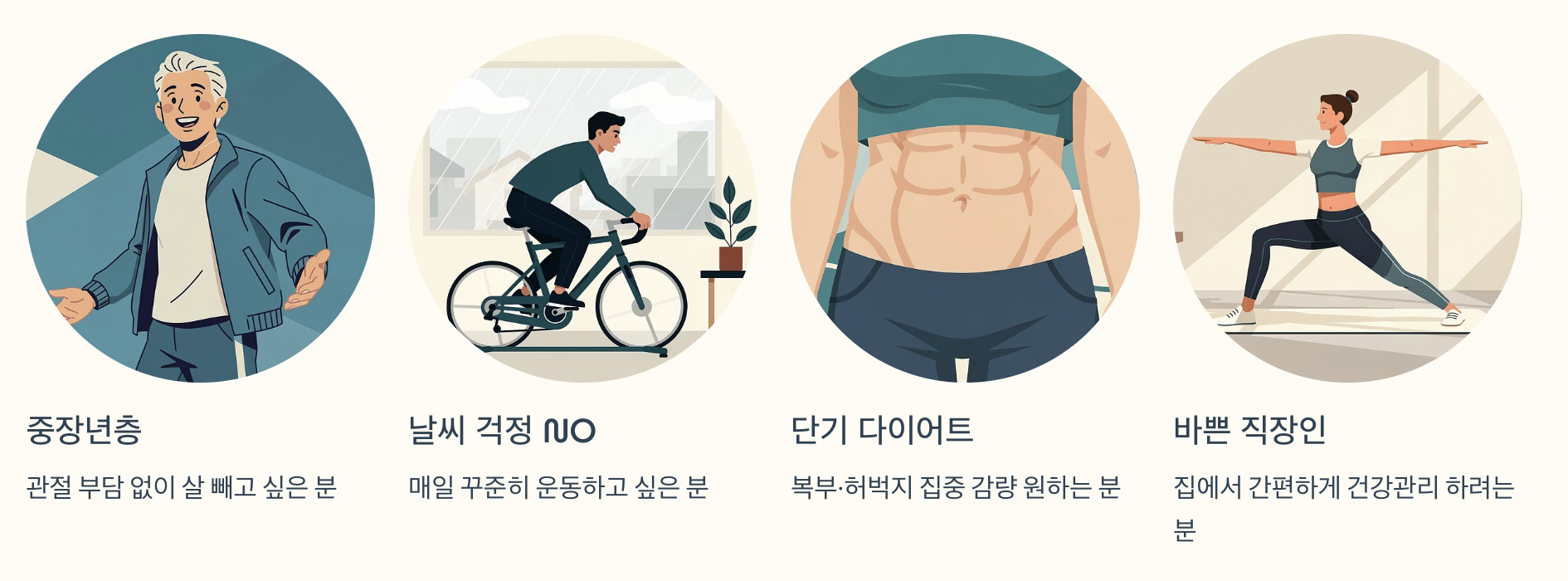 무릎이나 발목에 무리가 가지 않기 때문에 중장년층(40~60대)에게 특히 추천됩니다.