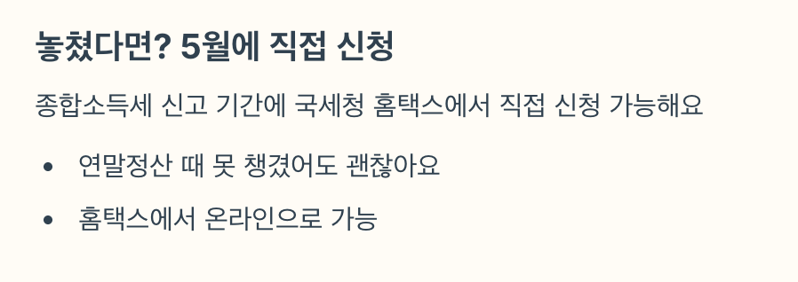 👉 5월에 ‘종합소득세 신고’ 때 국세청 홈페이지에서 직접 신청할 수 있어요.