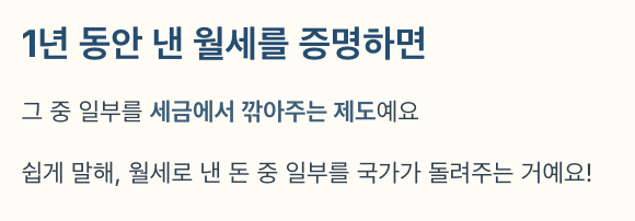 👉 "내가 1년 동안 낸 월세를 증명하면, 그 중 일부를 세금에서 깎아주는 제도"예요.