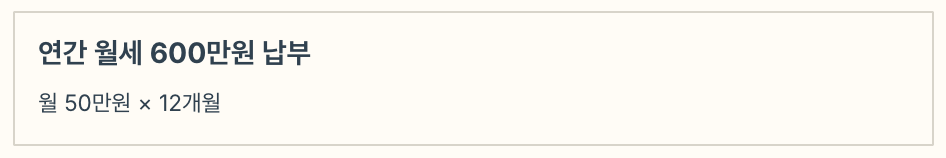 - 월세: 50만 원 x 12개월 = 600만 원