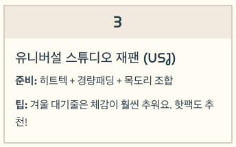 - 유니바 야간 + 야외 대기줄이 길다면 롱패딩도 “선택”으로 괜찮아요. (본인 체질 따라)