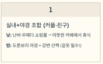 - 낮: 쇼핑몰(난바/우메다) → 카페
