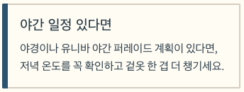 ✅ 팁: 출발 2~3일 전, 예보가 1~2℃만 달라도 체감이 크게 달라요. 특히 바람 강하면 밤이 훨씬 춥습니다.