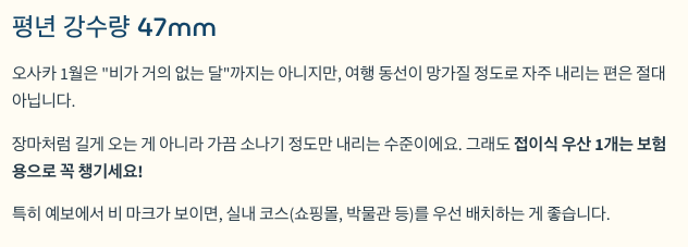 오사카 1월 평년 강수량은 47.0mm로, “비가 거의 없는 달”까지는 아니지만 여행 동선이 망가질 정도로 자주 내리는 편은 아닙니다.