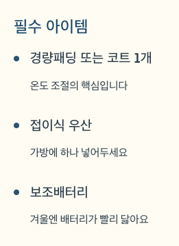 - 보조배터리(겨울엔 배터리 빨리 닳음)