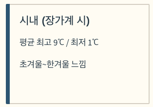 - 평균 최고기온 약 9℃ 전후 / 평균 최저기온 약 1℃ 전후