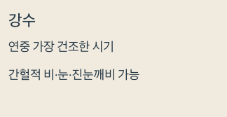 - “1월이 연중 강수량이 가장 적다”는 데이터가 있어, 전반적으로는 비교적 건조한 달로 보는 자료가 많아요.
