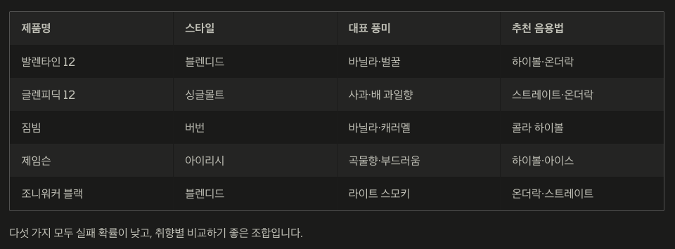 입문자라면 블렌디드 → 싱글몰트 순으로 접근하면 편합니다.