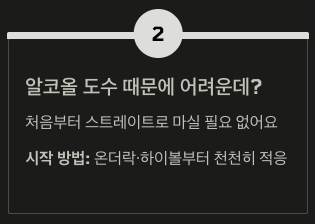 온더락·하이볼부터 시작해 천천히 도수에 적응해도 충분합니다.