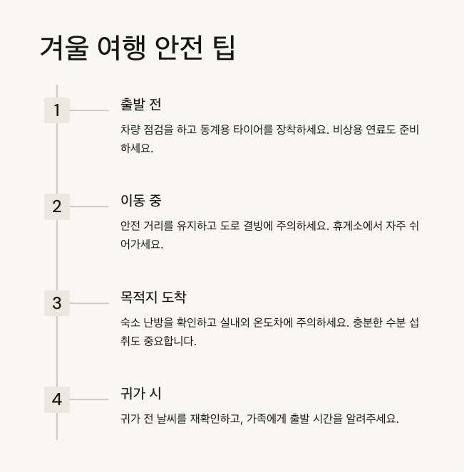 겨울철에는 기상 상황으로 인해 이동 시간이 늘어날 수 있으니 여유로운 일정으로 계획을 세우세요. 시간에 쫓기지 않도록 유연하게 준비하는 것이 중요합니다.