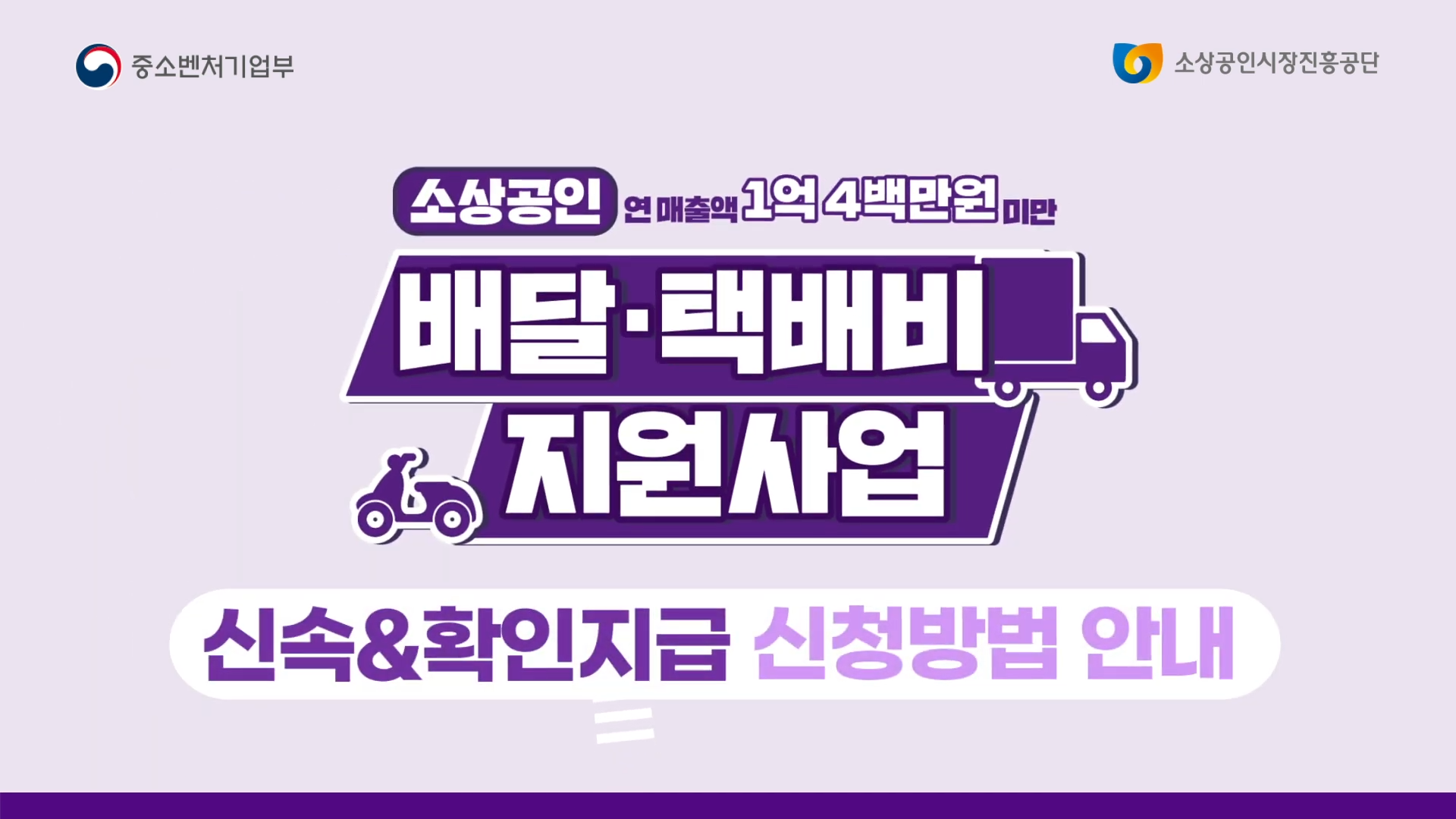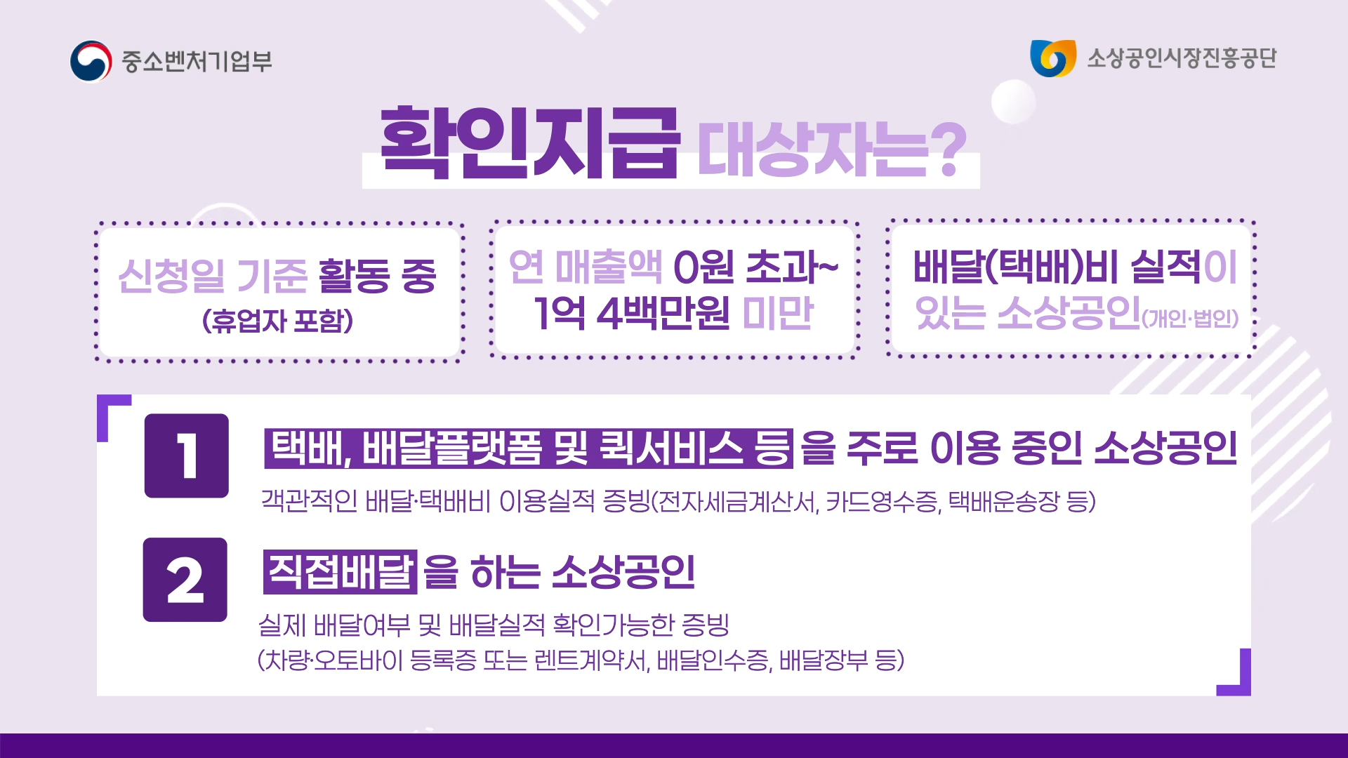 | 공통 요건 | - 2023년 또는 2024년 연매출 1억 400만 원 미만 - 배달 또는 택배 실적 존재 - 신청일 기준 폐업 상태가 아닐 것 |