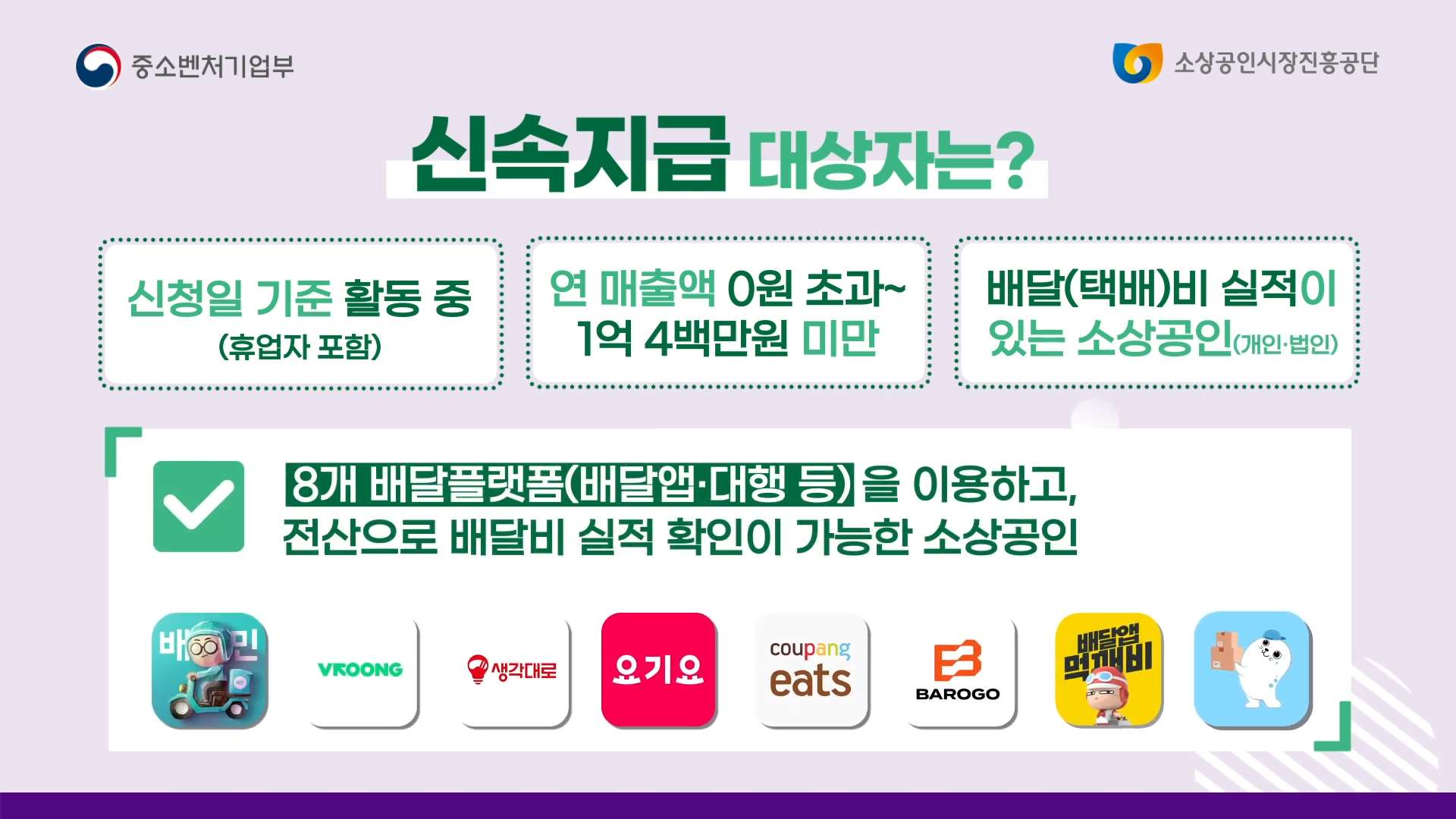 | 대상 조건 | 연매출 1억 400만 원 미만, 배달 실적 존재, 폐업하지 않은 사업자 |