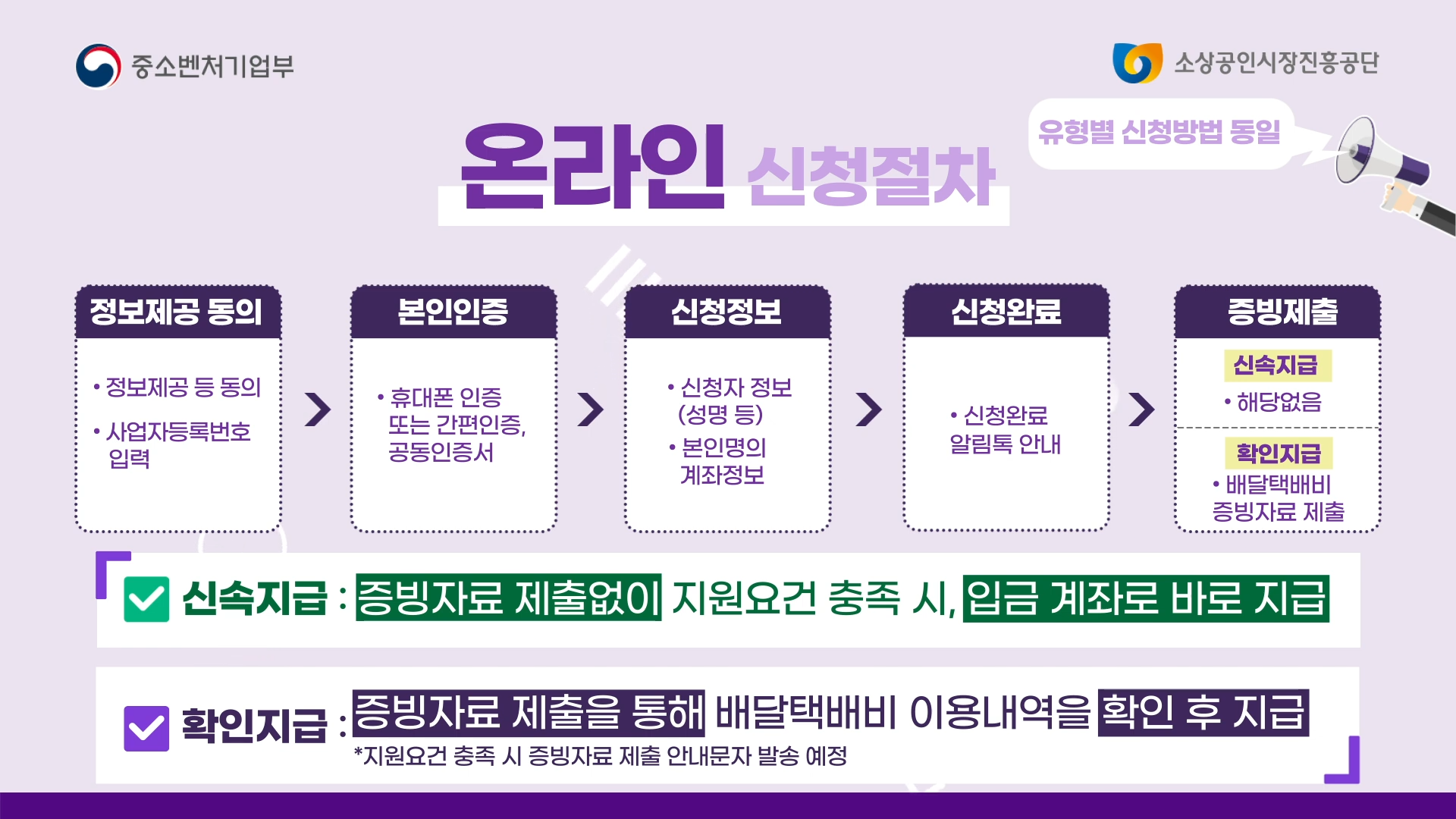 | 지원 방식 | 신속지급(자동 데이터 기준), 확인지급(증빙자료 제출) |