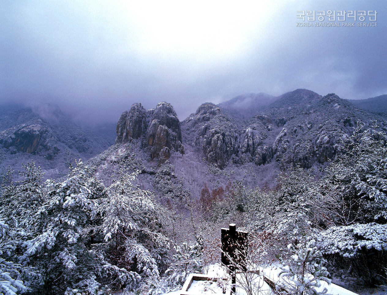 청송 주왕산은 겨울철 얼어붙은 폭포와 설경이 장관을 이루는 자연 명소입니다.