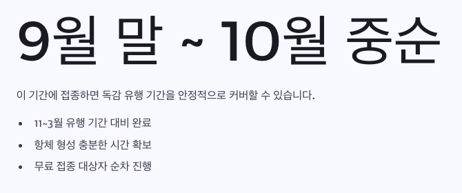 이 기간에 접종하면 11~3월 독감 유행 기간을 안정적으로 커버할 수 있습니다.