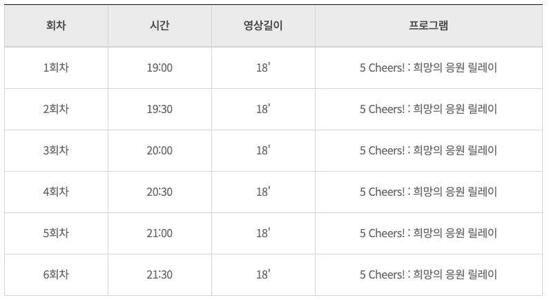19:00/ 19:30/ 20:00/ 20:30/ 21:00/ 21:30 (30분 간격 상영)